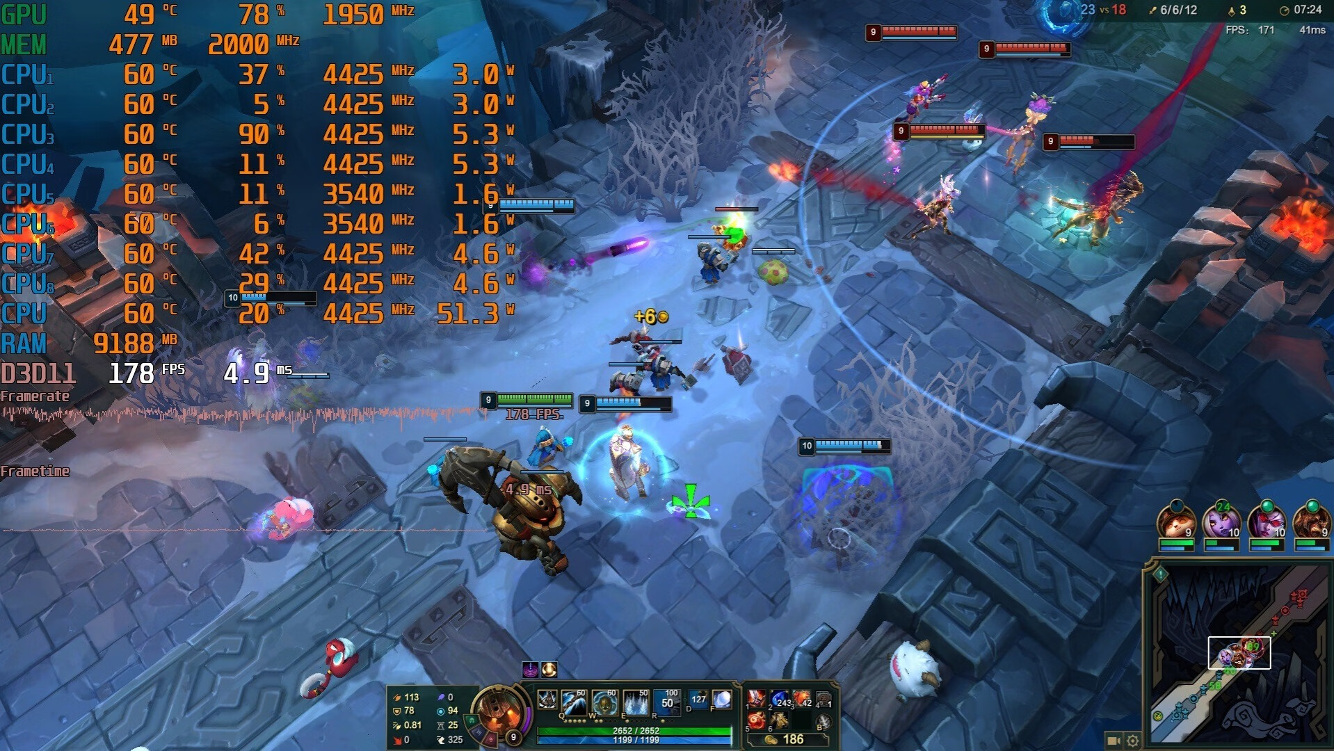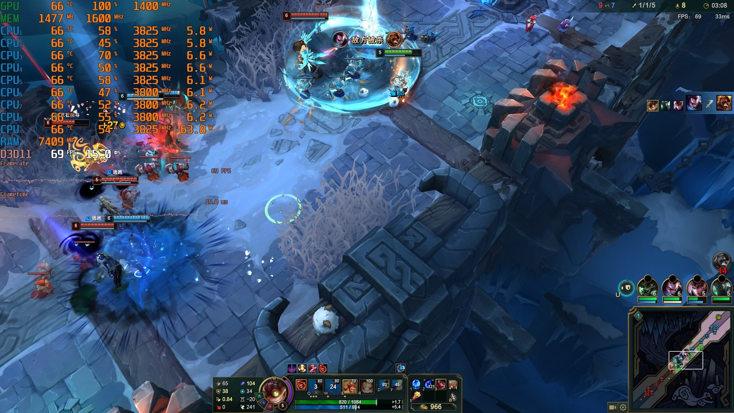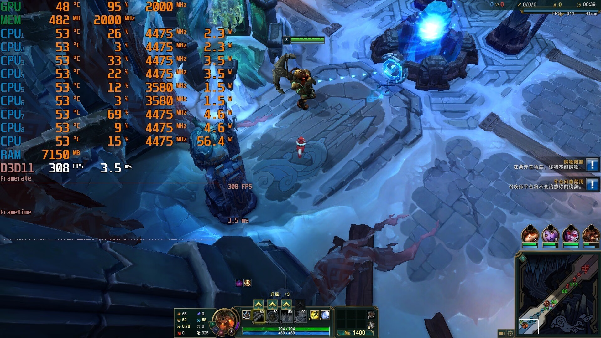 ▼再次进入LOL大乱斗模式,2K分辨率,全极高画质,泉水游戏帧数在233帧,非常流畅。