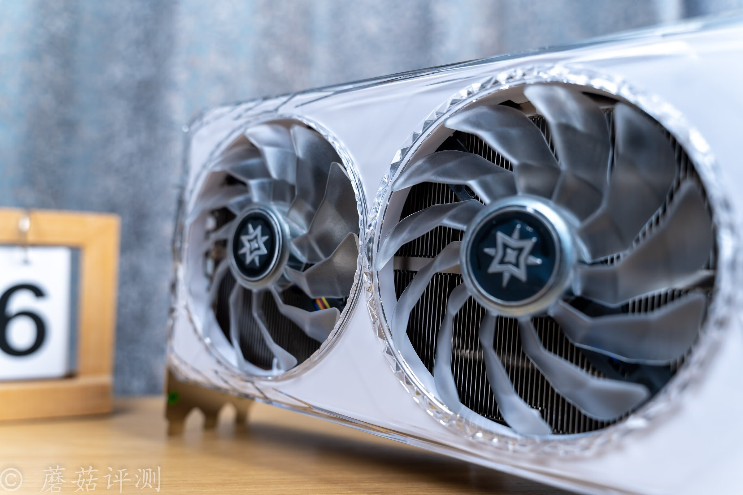 ▼显卡散热风扇的扇叶是磨砂质感、半透明的,有一定的柔光效果,也支持ARGB灯效。