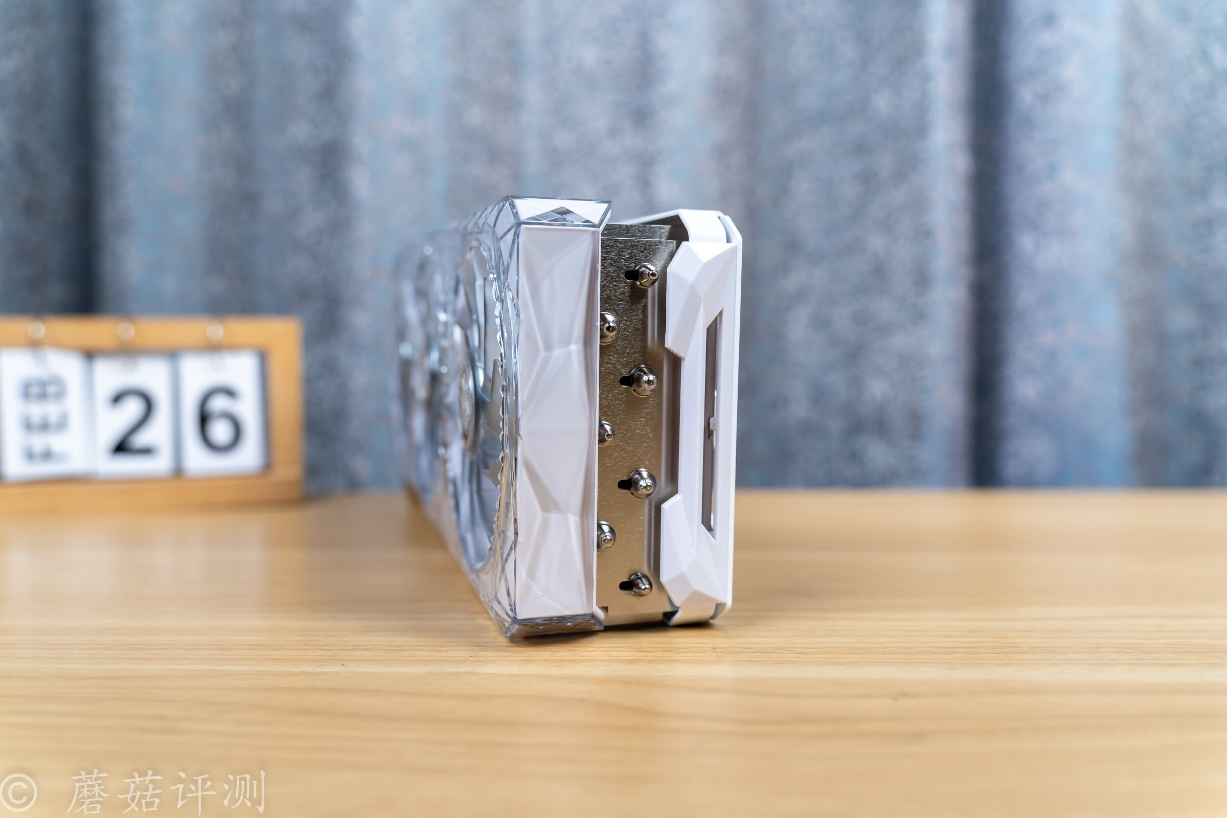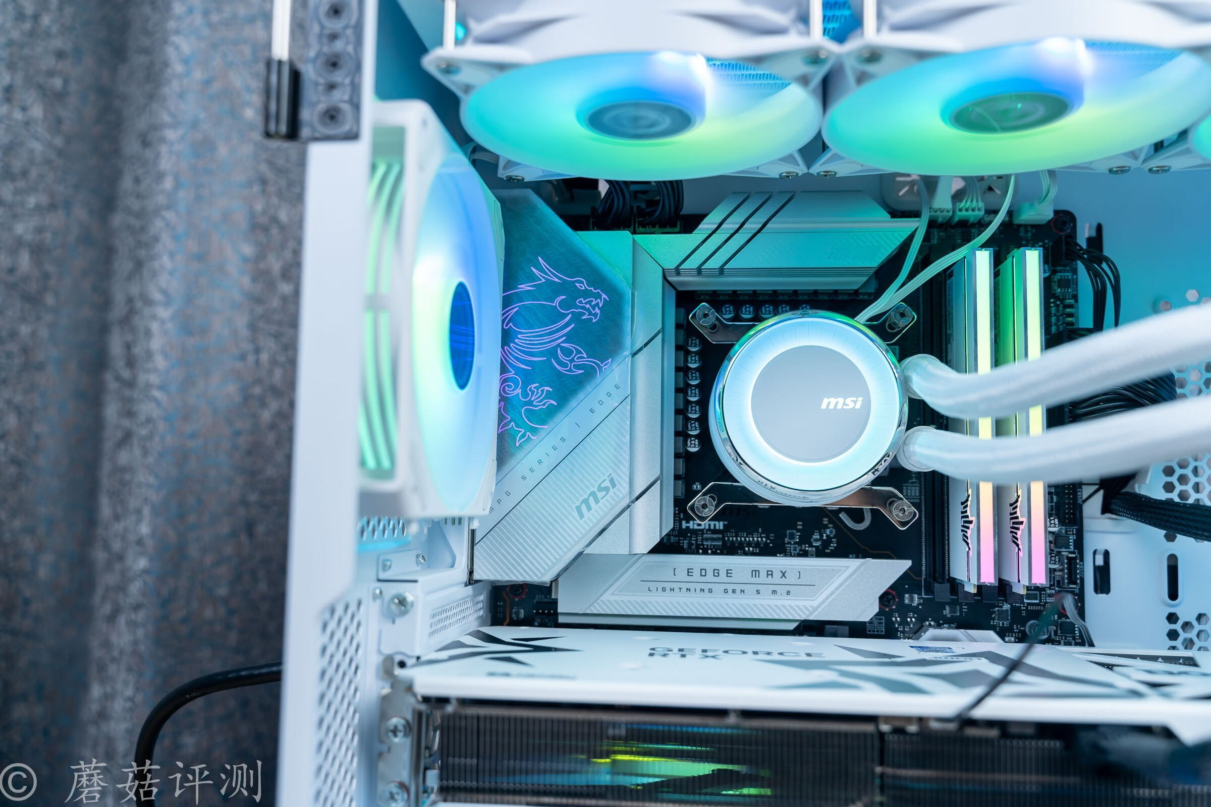 ▼水冷是微星的寒冰E360白色限定版,这款水冷的水冷头灯效设计很有意思,ARGB灯效不是直接透出来的,而是通过漫反射出来的,整体的效果会更加高级。散热方面,水冷头采用经典的双腔设计,搭配大体积的铜质底座和高密度微水道设计,可以快速带走处理器表面的热量,提高散热效果。