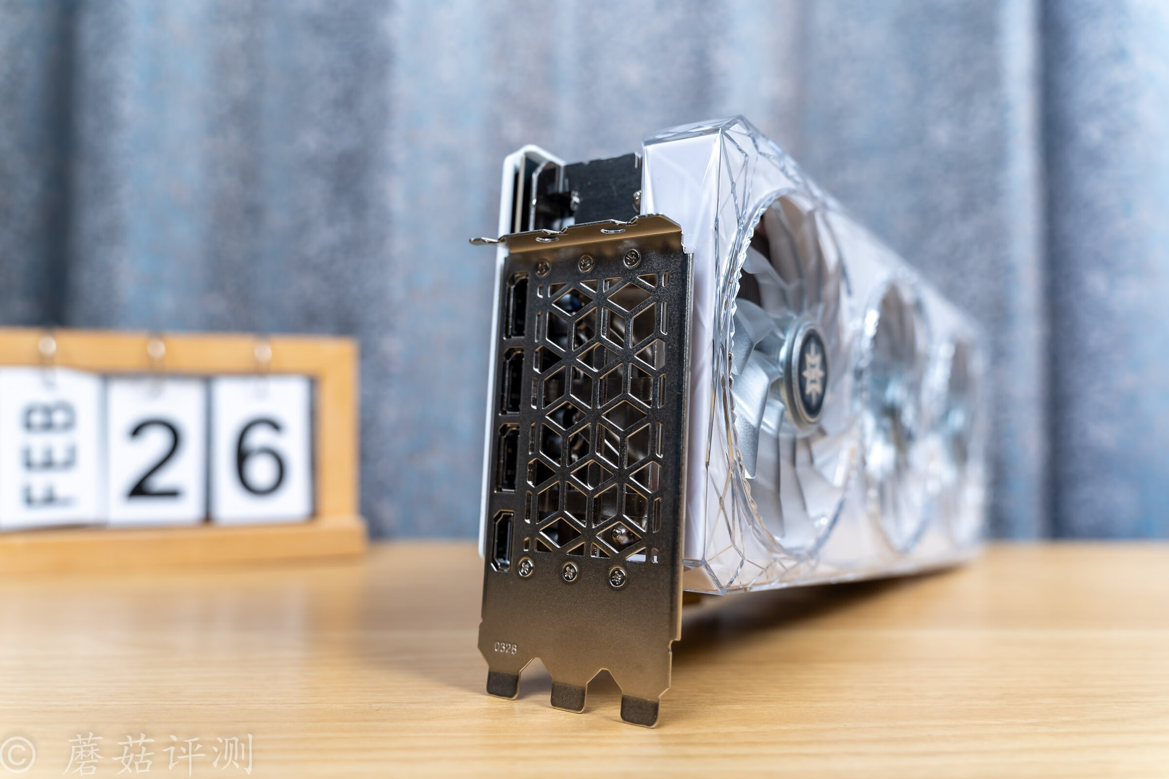 ▼显卡标配的PCIe金属挡板采用三槽设计,上面有四个视频输出接口,三个DP、一个HDMI。