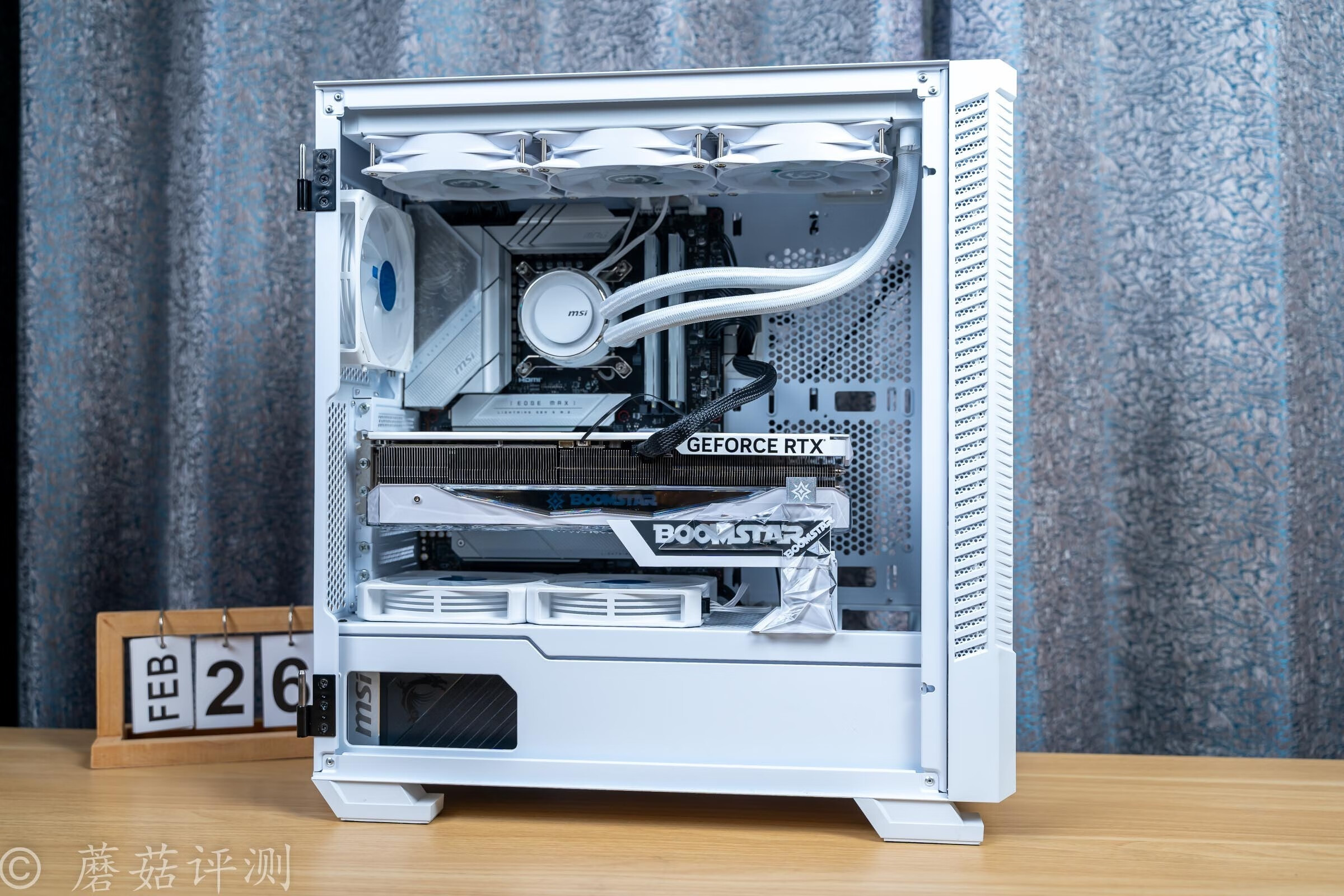 ▼机箱是微星的刀锋100R,这款机箱的外观设计非常漂亮,机箱的正面和侧面标配有大面积的侧透玻璃,且是白透设计的,可以很好的展示机箱内部的硬件。在机箱前部玻璃侧透的内部,标配了三把白色的、支持ARGB灯效的机箱风扇,既好看,又能在机箱的前部提供充足的进风。
