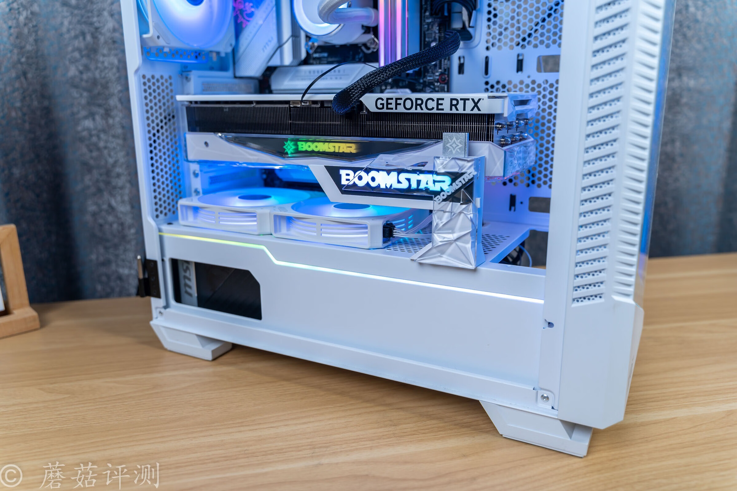 ▼机箱的内部结构很传统,底部是熟悉的独立电源仓,但在电源仓侧面的顶部,标配有一条RGB灯带,可以很好的平衡机箱侧面整体的RGB灯效的视觉观感,不会有头重脚轻的感觉。在电源仓的顶部,还有多个机箱风扇位,可以安装风扇,专门照顾显卡部分的散热。