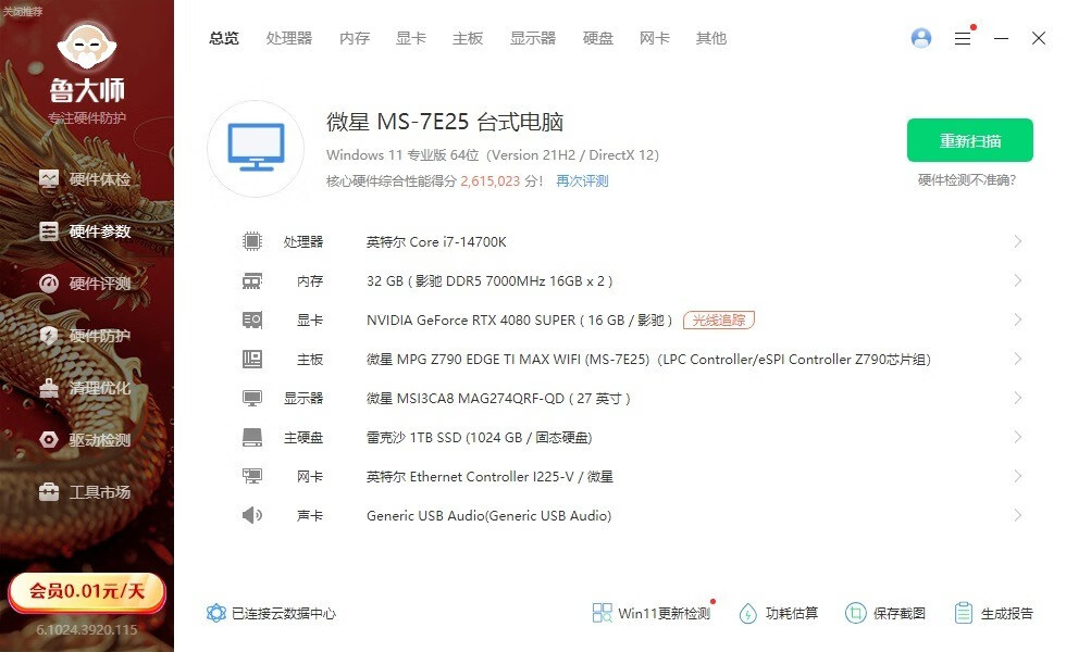 ▼整机配置一览,处理器是14700K,主板是微星的Z790刀锋MAX,显卡是影驰的RTX4080 Super星曜OC,整机配置很强。
