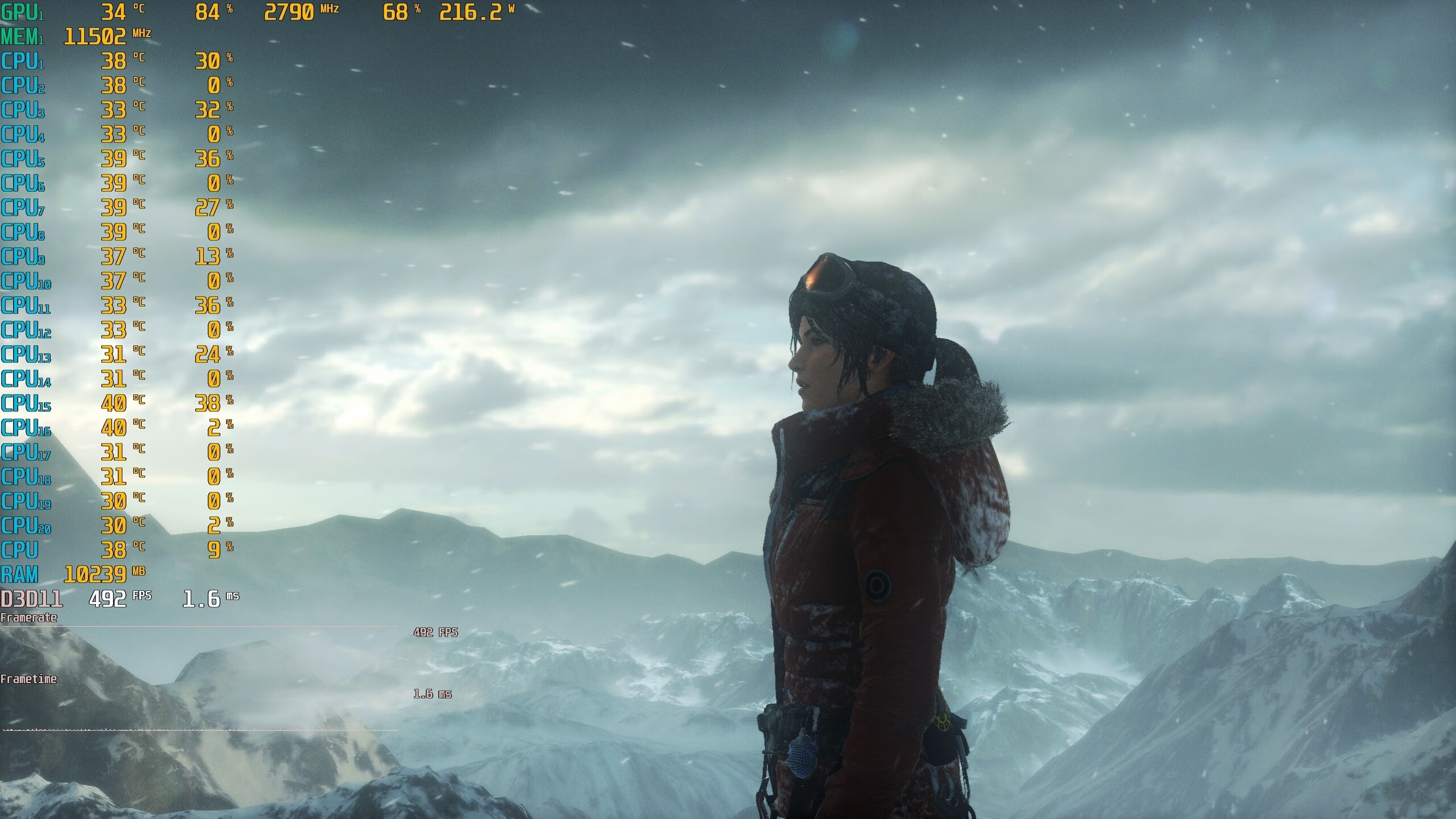▼古墓丽影,2K分辨率,全高画质,第一个测试场景,游戏帧数在492帧左右,很流畅。