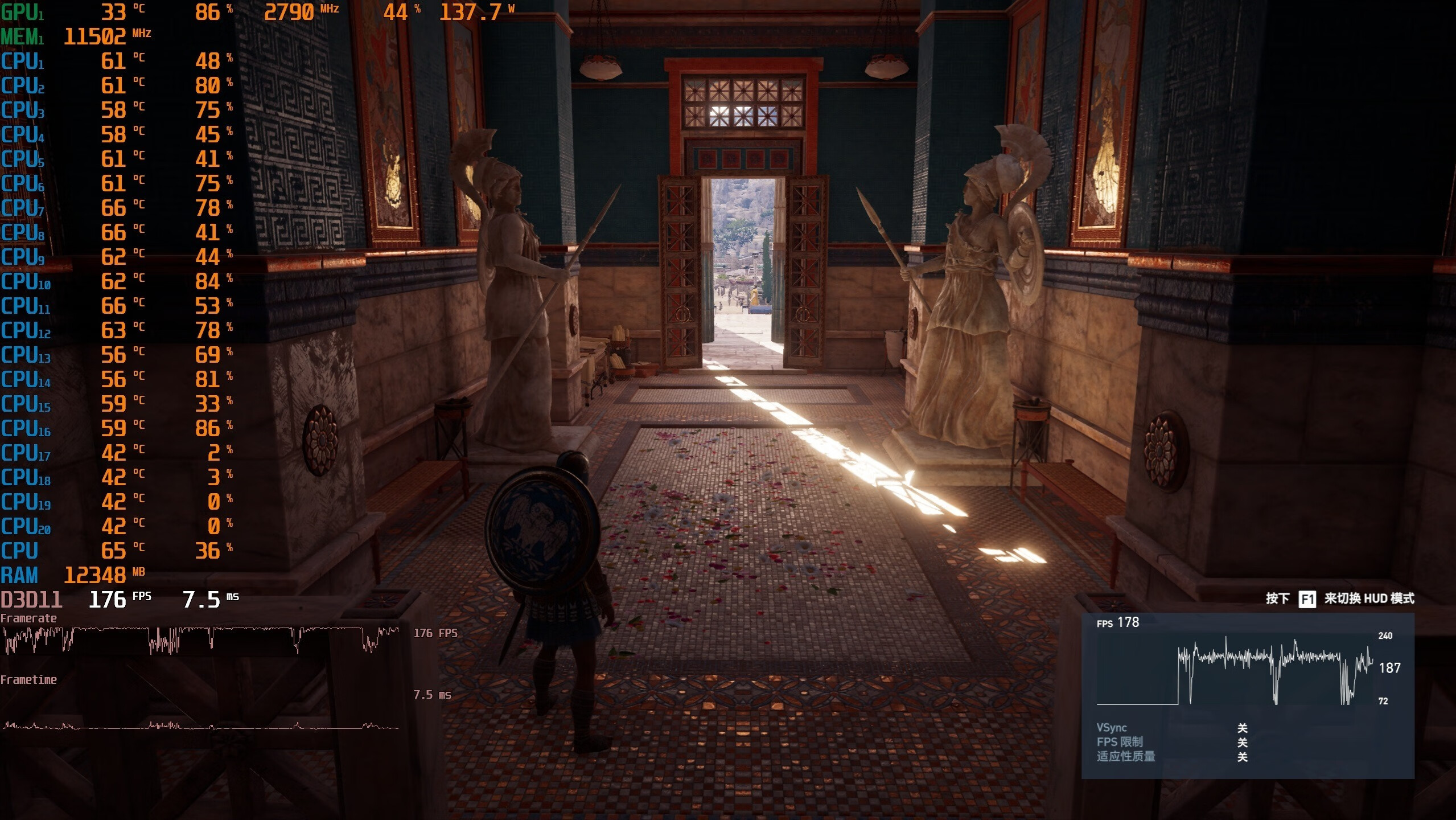 ▼众生平等奥德赛,2K分辨率,全极高画质,体积云最低,走廊游戏帧数176帧左右。