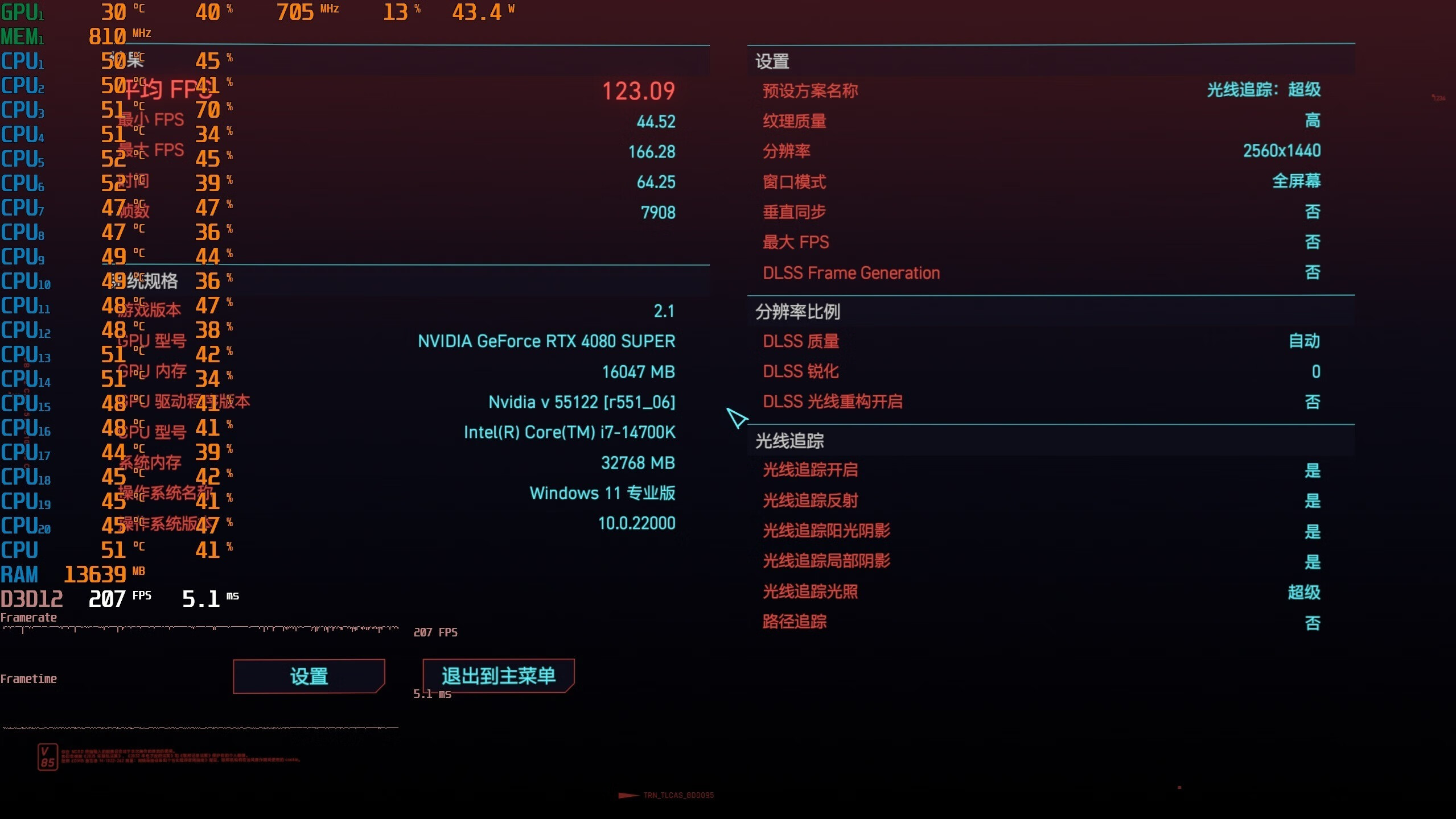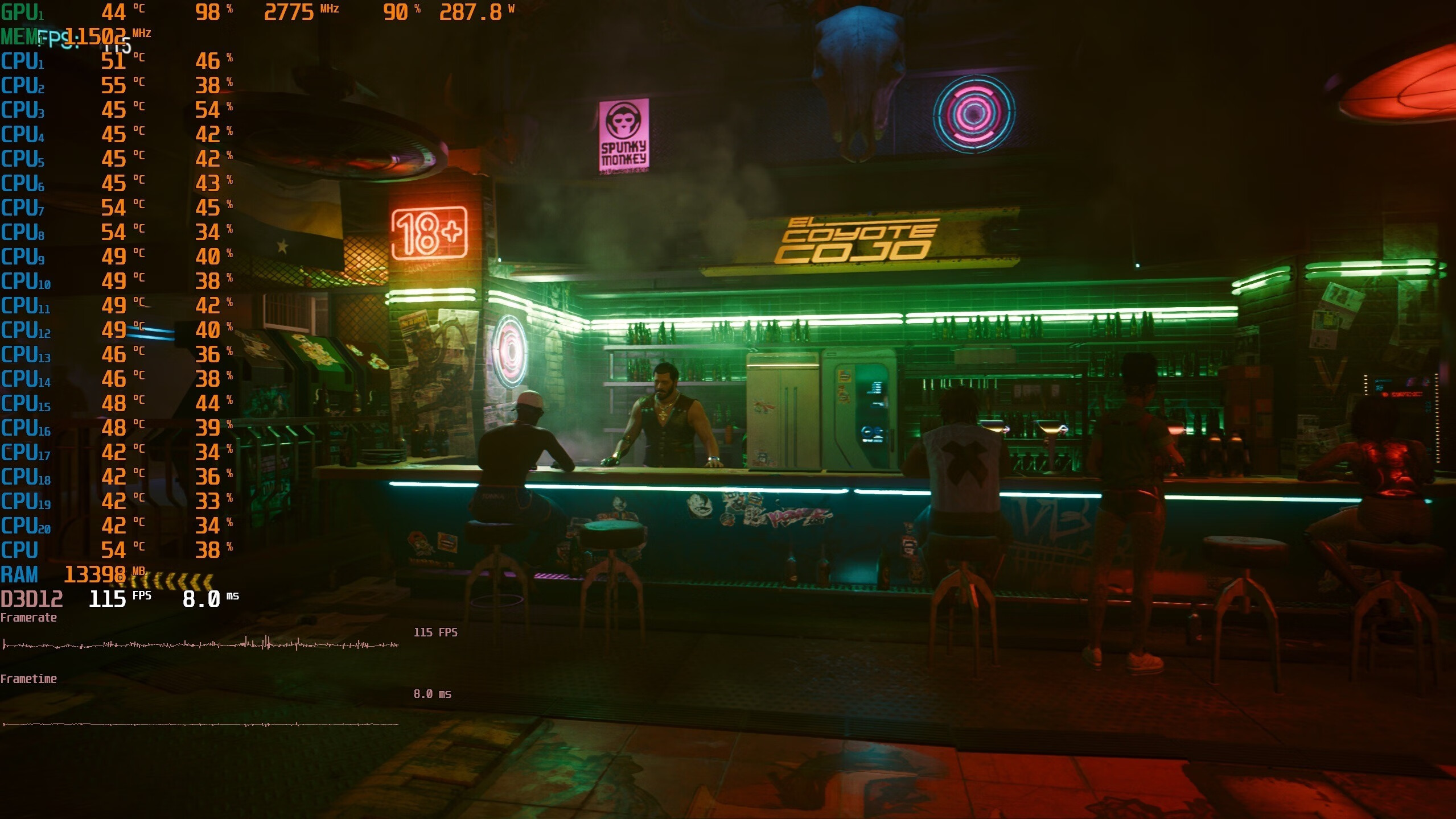 ▼赛博朋克2077,2K分辨率,光追超级画质,大力水手DLSS自动,酒吧游戏帧数在115帧左右。