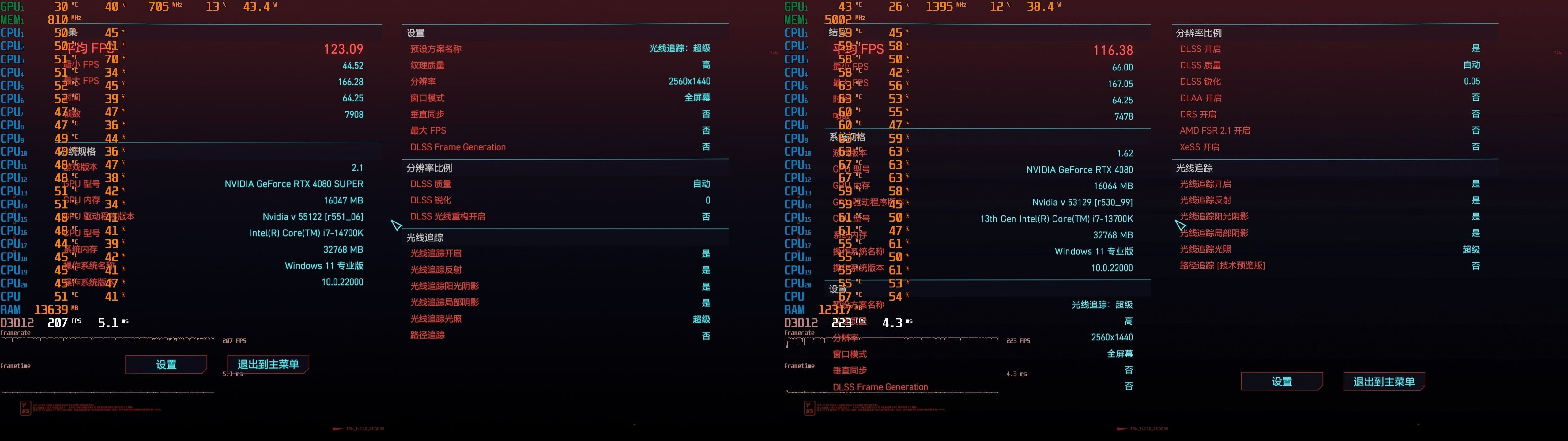 ▼横向对比下RTX4080,左侧是RTX4080 Super、右侧是RTX4080,相同场景,功耗小了20W左右,但游戏帧数表现几乎一致,也是伯仲之间。