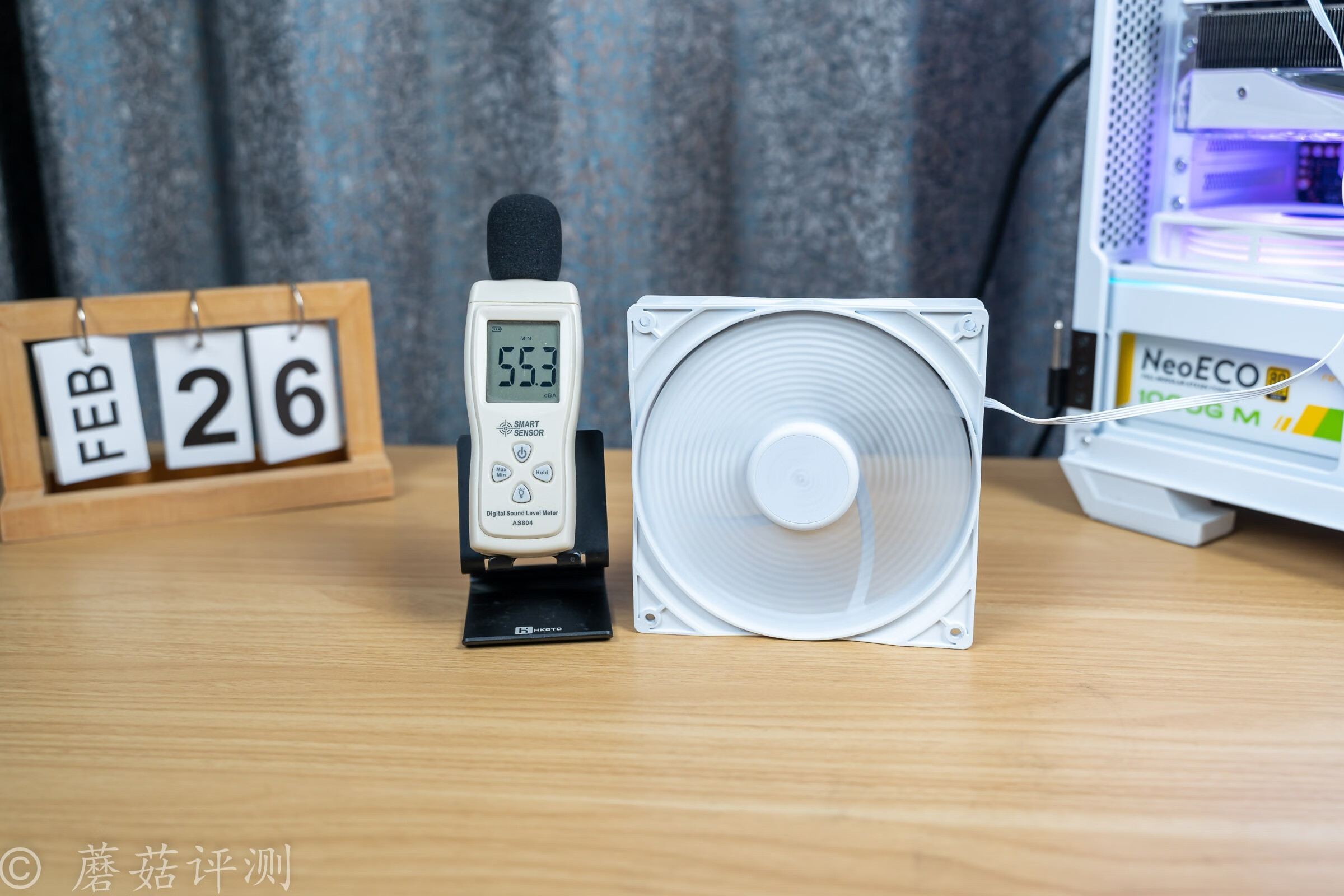 ▼单独测试风扇的静音效果,默认情况下,环境噪音表现在54.8dB,比刚刚安静了一些。