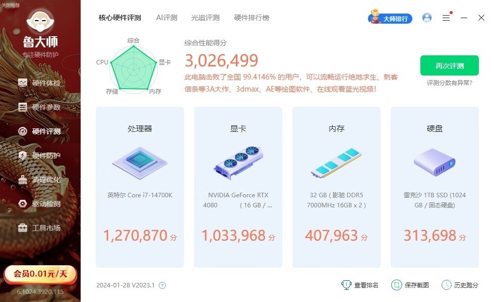 ▼整机配置一览,处理器是14700K,显卡是影驰的RTX4080星耀OC,主板是微星的Z790刀锋MAX,整机配置很强。