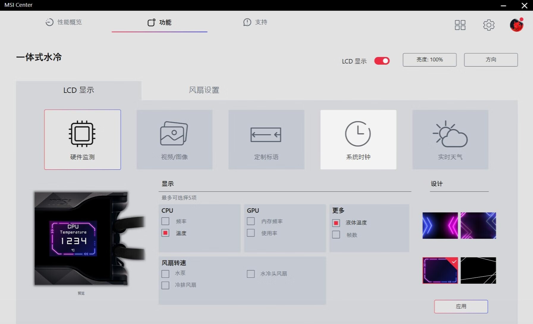 ▼水冷支持软件控制,通过自家的MSI Center软件就可以轻松控制。默认界面显示的内容就非常丰富,右上角还有一些功能选项,例如屏幕的开关、亮度和方向等。