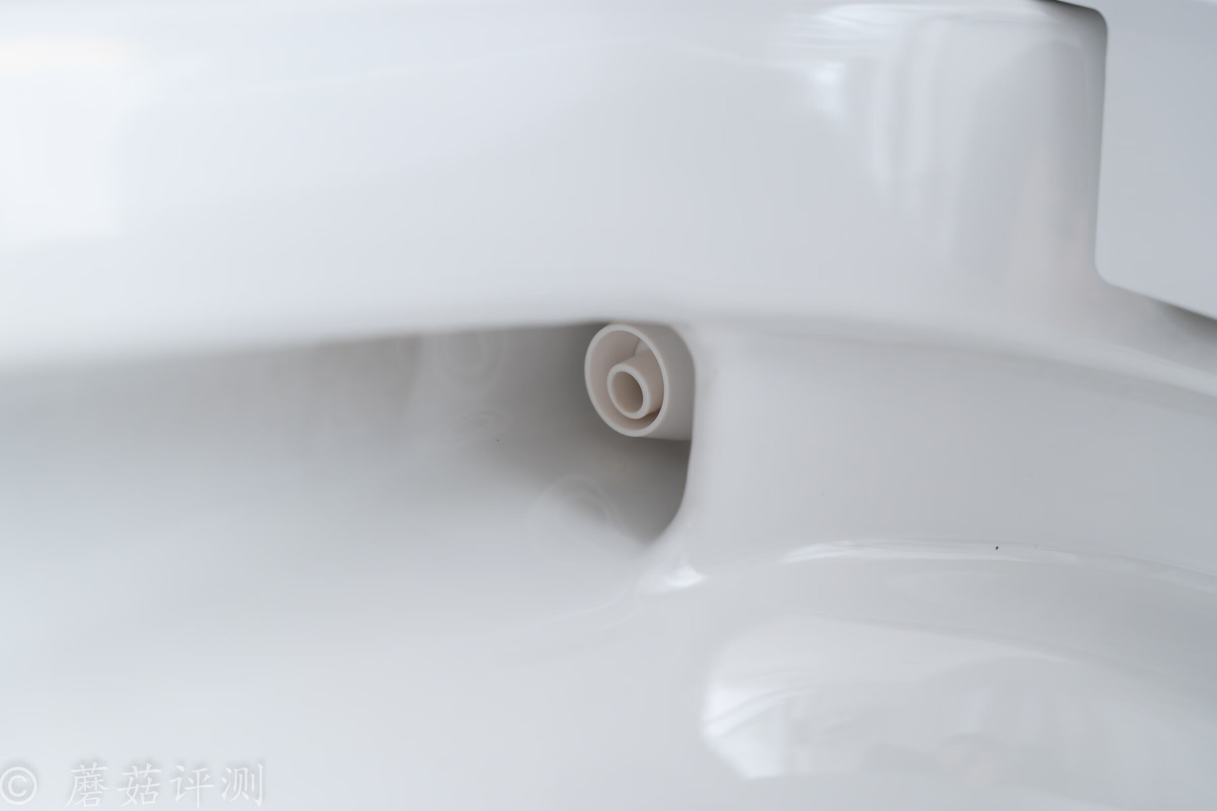 ▼马桶上部水道的出水口,有角度设计的,不是直出的,老款的Qe5是直出的。出水的角度,搭配渐变的弧度阶梯,可以轻松靠着较少的水量,充分润湿马桶侧面。
