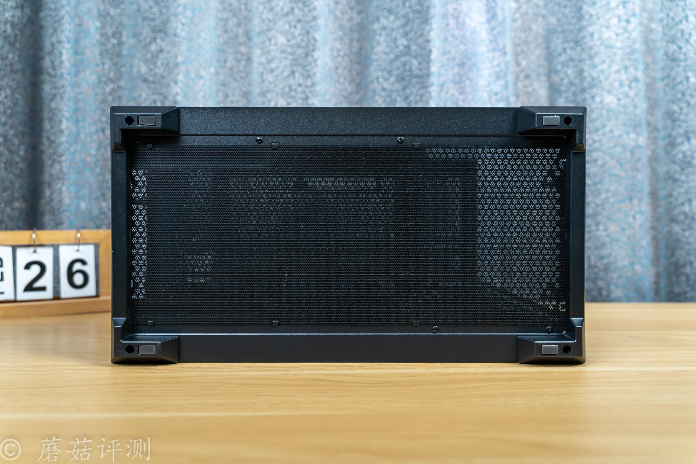 ▼机箱底部,四角有四个防滑脚垫,中间是大面积的金属防尘网。