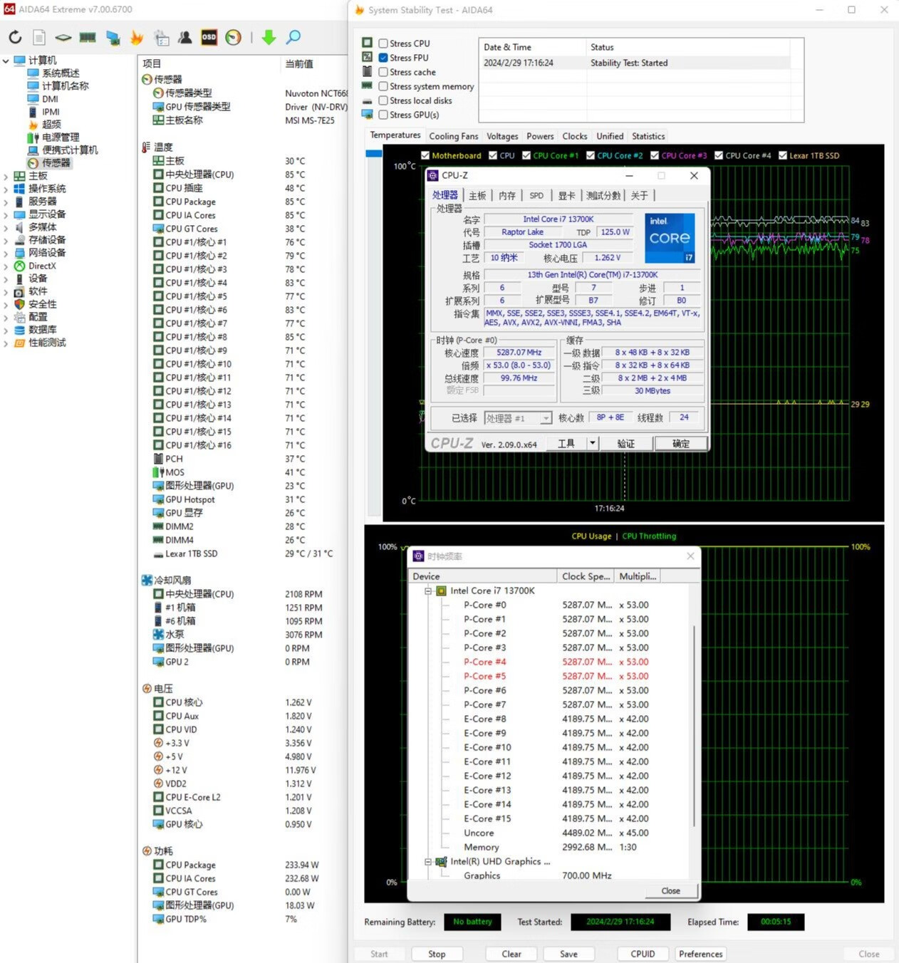 ▼单烤FPU测试,处理器功耗在240W左右,大核心睿频5.3GHz,小核心睿频4.2GHz,温度在85℃左右,非常不错。