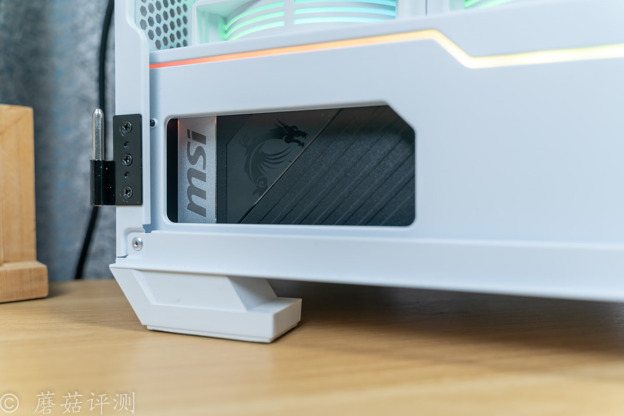 ▼机箱是微星的刀锋100R,机箱的前部和侧面标配有大面积的玻璃侧透,白透设计的,可以更好的展示机箱内部的硬件。另外在机箱的前部,标配了三把白色的、支持ARGB灯效的机箱风扇,搭配机箱前部的玻璃侧透,效果不错。