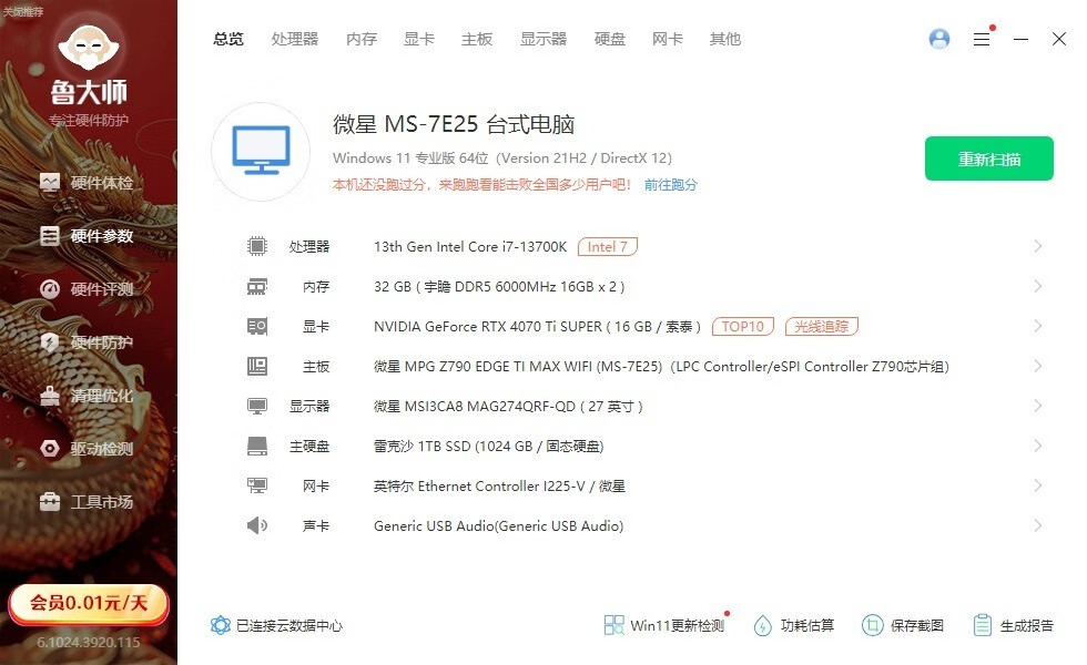 ▼整机配置一览,处理器是13700K,主板是微星的Z790 EDGE Ti MAX,显卡是索泰的RTX4070 Ti Super OC月白。