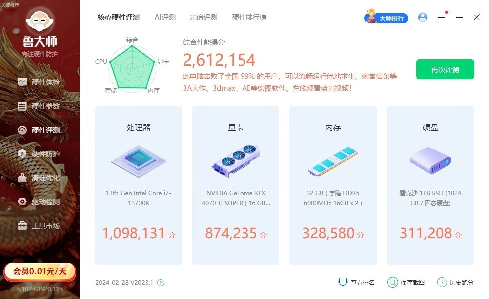 ▼简单跑个整机测试,整机得分261W,其中处理器单独得分109.8W,显卡单独得分87.4W,分数都很给力。