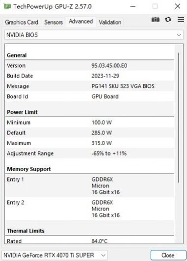 ▼简单看下显卡的BIOS,默认功耗给到了285W,最大功耗可以去到315W。