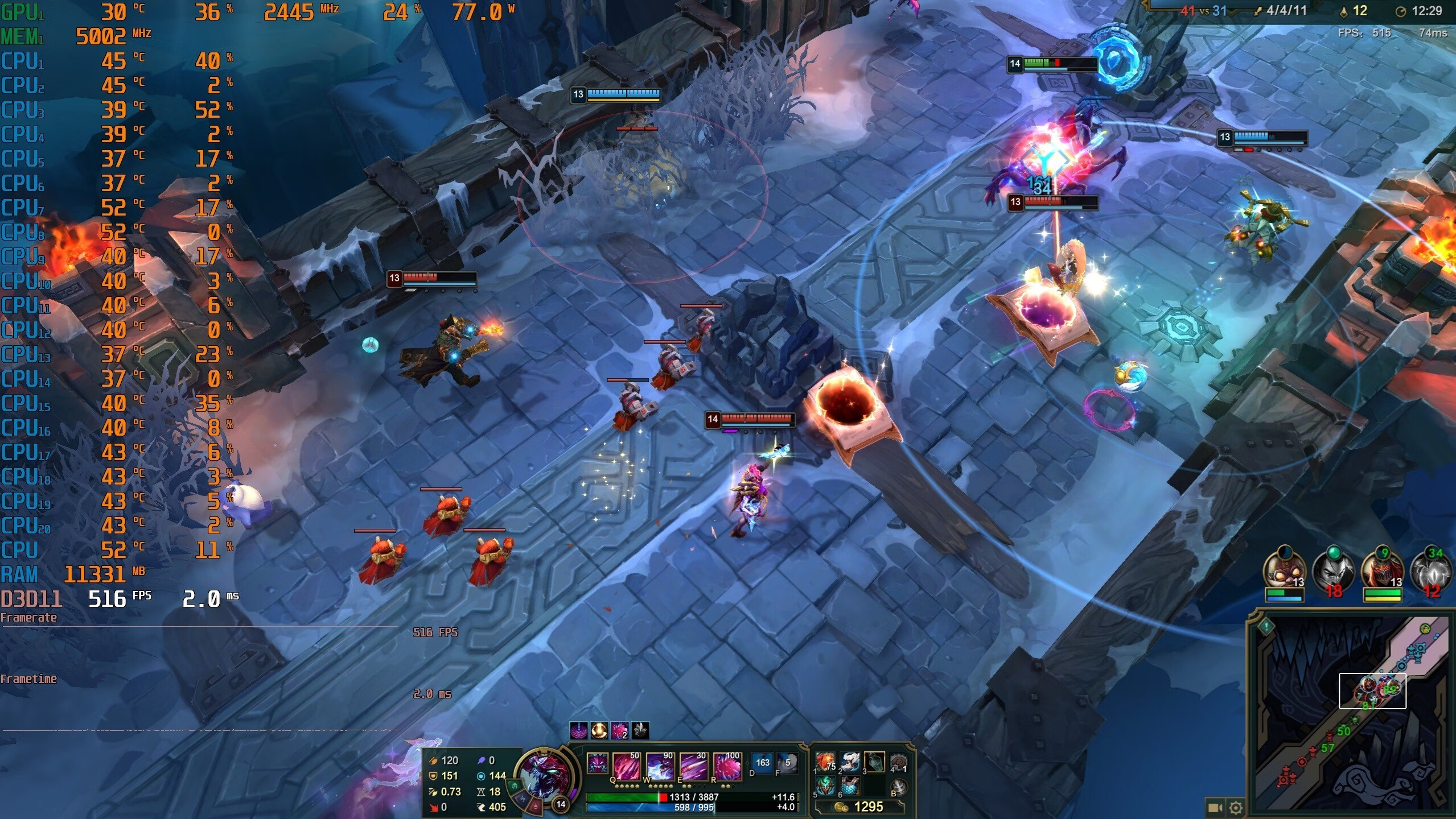▼游戏实测,LOL大乱斗模式,2K分辨率,全极高画质,泉水的游戏帧数在1041帧左右,表现非常不错。