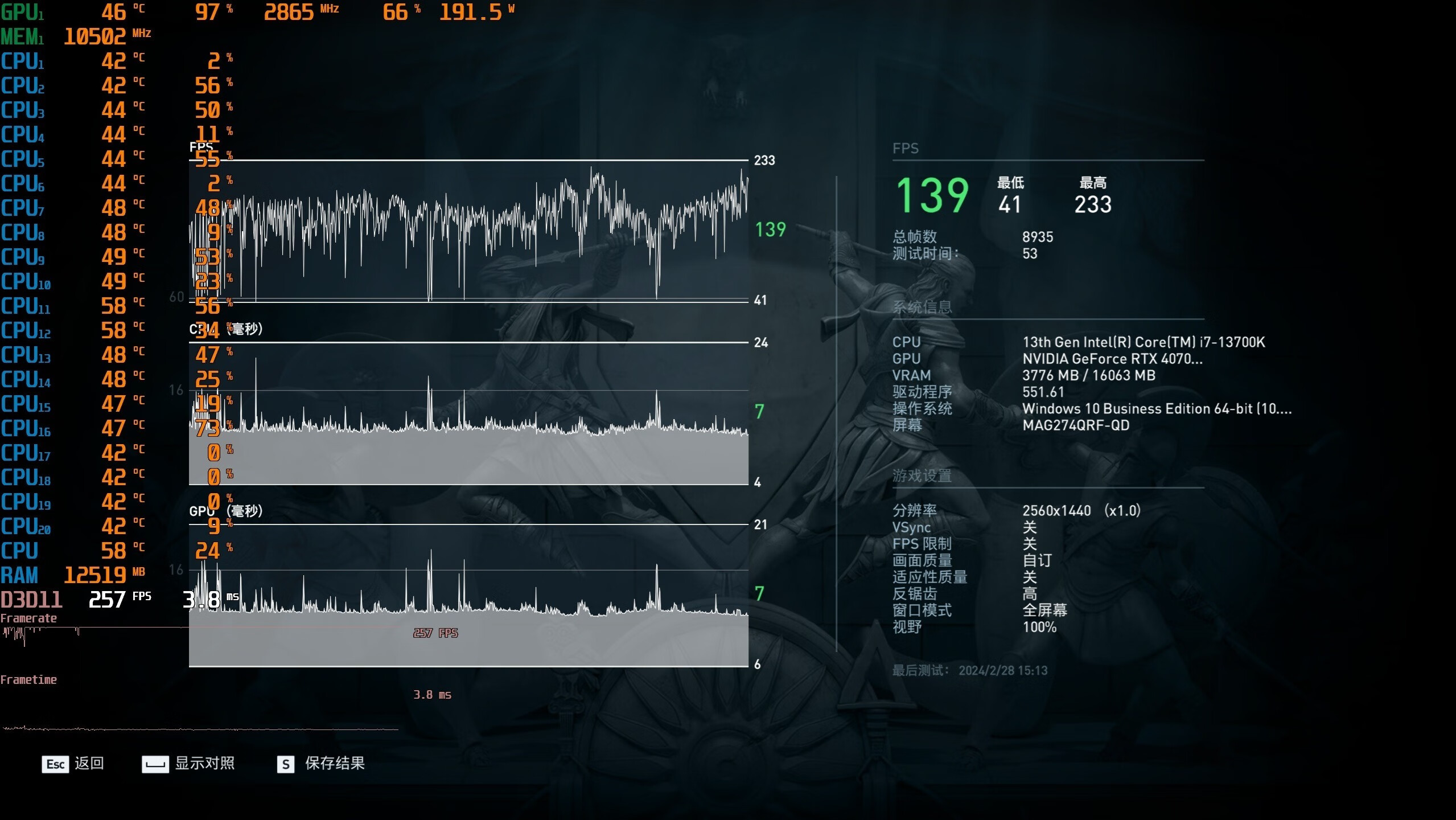 ▼最后的整体平均游戏帧数,在139帧左右,这个游戏帧数很不错,平时可以畅玩。