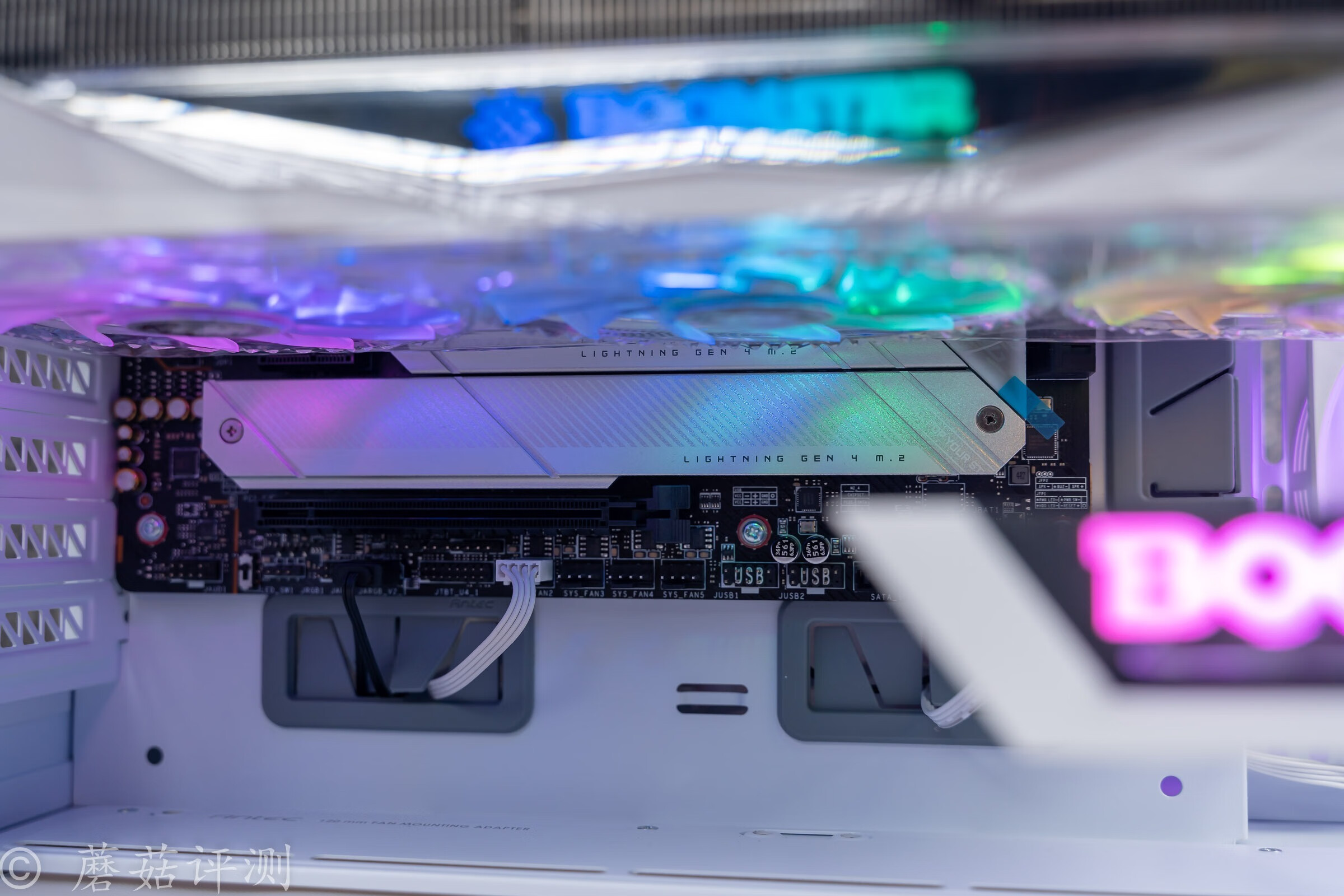 ▼蘑菇最喜欢的角度,就是从这个角度看过去,安钛克C8这款海景房机箱的内部空间非常给力,搭配RTX4080 Super显卡,无论是横向空间、还是纵向空间,都非常充足,显卡的PCIe 5.0供电线可以轻松走线。