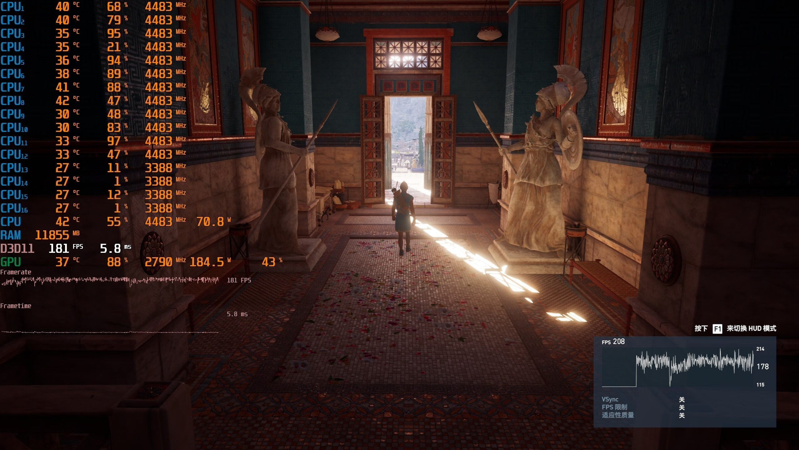 ▼众生平等奥德赛,2K分辨率,全极高画质,体积云最低,走廊游戏帧数在181帧左右,显卡占用88%。